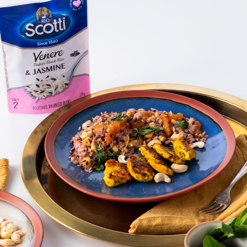 Riso Scotti’s Venere&Jasmine with grilled chicken, dried apricots and cashews.